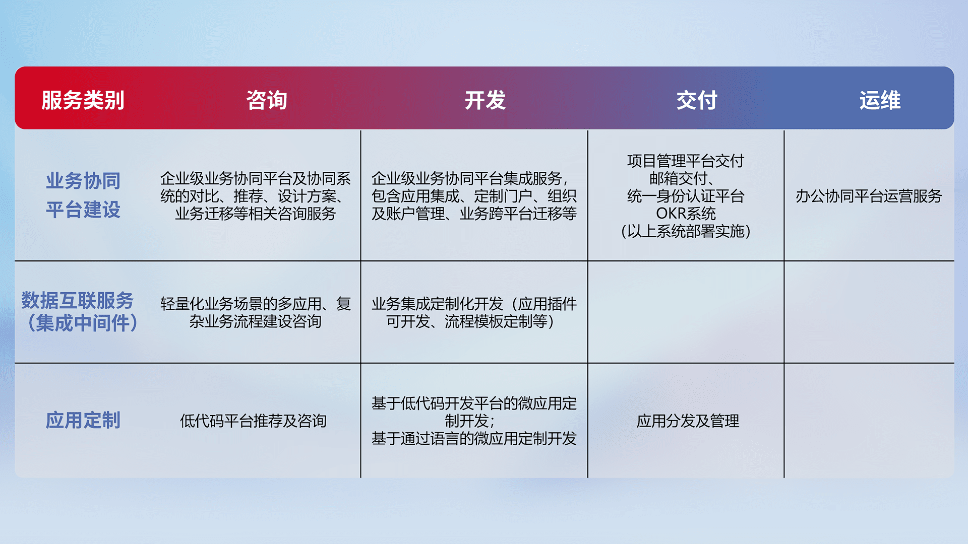 针对钉钉、、、企微、、、IDaas等平台级产品提供产品的规划、、、、方案、、、、交付、、、定制化开发等服务,,,,实现如统一协同办公、、、、智能客户服务、、、混合会议管理、、智能数据查询、、、等业务场景,,实现数字化转型。。。。