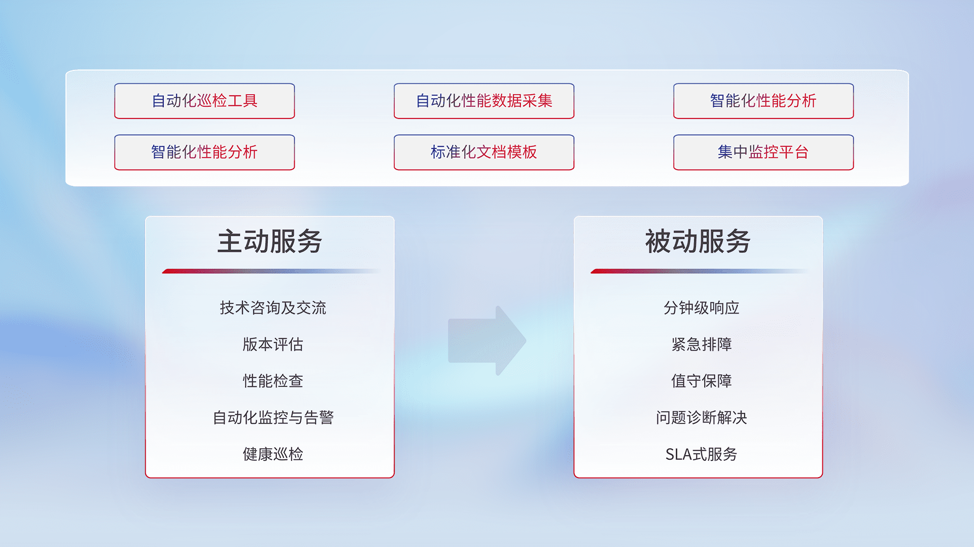 智能化工具和标准化文档,,,,保障服务质量,,,提供主动服务(包含技术咨询、、版本评估、、、性能检查、、、、自动化监控与告警、、、、健康巡检)和被动服务包含(分钟级响应、、紧急排障、、值守保障、、、、问题诊断解决、、、SLA服务)。。